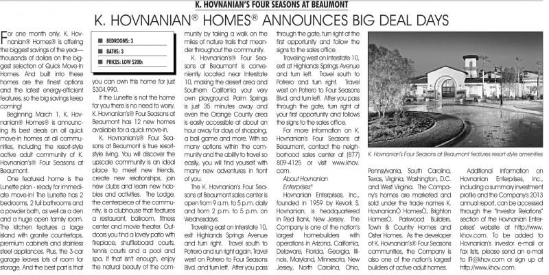 Beginning March 1, k. Hovnanian® Homes® is announcing its best deals on all quick move-in homes at all communities, including the resort-style active adult community of k. Hovnanian’s® Four Seasons at Beaumont.