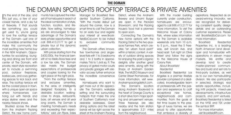 “With the model debut just around the corner, now is asmart time to call The Domain for an early tour and register your interest at www.BrookfieldSocal.com to be invited to exclusive community events.”