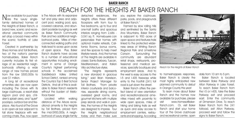 available for purchase are the luxury singlefamily detached homes of the Heights at Baker Ranch, abrand new, scenic and recreational oriented community set atop a broad mesa within the scenic foothills of Lake Forest.