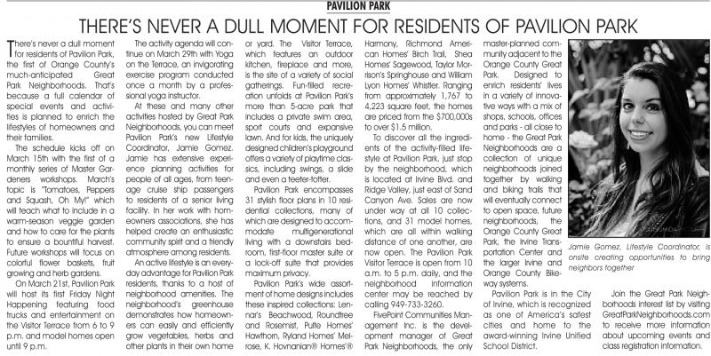 never a dull moment for residents of Pavilion Park, the first of orange County’s much-anticipated Great Park Neighborhoods. That’s because a full calendar of