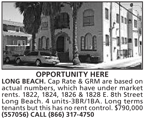OPPORTUNITY HERE LONG BEACH. Cap Rate & GRM are based on actual numbers, which have under market rents. 1822, 1824, 1826 & 1828 E. 8th Street Long Beach. 4 units-3BR/1BA. Long terms tenantsbut this hasnorentcontrol.$790,000 (557056) CALL (866) 317-4750