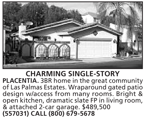 CHARMING SINGLE-STORY PLACENTIA. 3BRhomeinthe greatcommunity of LasPalmas Estates. Wraparound gated patio design w/access from many rooms. Bright &open kitchen, dramatic slateFPinliving room, & attached 2-car garage. $489,500 (557031) CALL (800) 679-5678