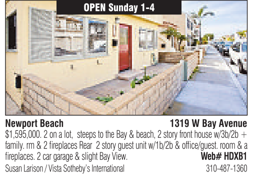 NewportBeach OPEN Sunday 1-4 1319 WBay Avenue $1,595,000. 2onalot, steeps to the Bay &beach, 2story front house w/3b/2b +family.rm&2fireplaces Rear 2story guest unit w/1b/2b &office/guest. room &a fireplaces. 2car garage &slight Bay View. Web# HDXB1 Susan Larison /Vista Sotheby’s International 310-487-1360