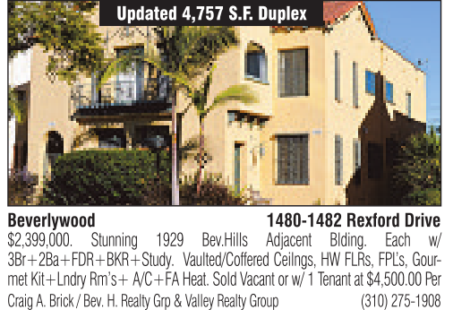 Beverlywood Updated 4,757 S.F. Duplex 1480-1482 Rexford Drive $2,399,000. Stunning 1929 Bev.Hills Adjacent Blding. Each w/ 3Br+2Ba+FDR+BKR+Study. Vaulted/Coffered Ceilngs, HW FLRs, FPL’s, Gourmet Kit+Lndry Rm’s+ A/C+FA Heat. Sold Vacant or w/ 1Tenant at $4,500.00 Per Craig A. Brick /Bev.H.Realty Grp &Valley Realty Group (310) 275-1908