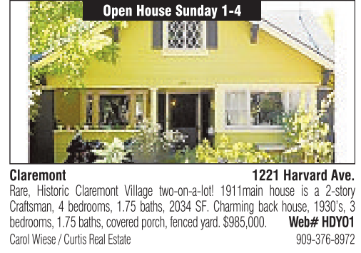 Claremont Open House Sunday 1-4 1221 Harvard Ave. Rare, Historic Claremont Village two-on-a-lot! 1911main house is a 2-story Craftsman, 4bedrooms, 1.75 baths, 2034 SF. Charming back house, 1930’s, 3bedrooms, 1.75 baths, covered porch, fenced yard. $985,000. Web# HDYO1 Carol Wiese /Curtis Real Estate 909-376-8972