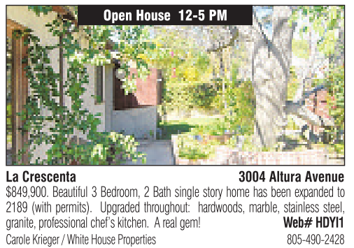 La Crescenta Open House 12-5 PM 3004 Altura Avenue Carole Krieger /White House Properties 805-490-2428 $849,900. Beautiful 3Bedroom, 2Bath single story home has been expanded to 2189 (with permits). Upgraded throughout: hardwoods, marble, stainless steel, granite, professional chef’s kitchen. Areal gem! Web# HDYI1