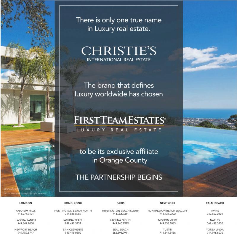 24 There is only one true name in Luxury real estate. The brand that defines luxury worldwide has chosen FirstTeamEstates to be its exclusive affiliate in Orange County THE PARTNERSHIP BEGINS BENHAVIS, SPAIN ¤7,750,000 ©2014 First Team Estates ® . All rights reserved. LONDON HONG KONG PARIS NEW YORK PALM BEACH ANAHEIM HILLS HUNTINGTON BEACH NORTH HUNTINGTON BEACH SOUTH HUNTINGTON BEACH SEACLIFF IRVINE 714.974.9191 714.848.8080 714.964.3311 714.536.9292 949.857.2121 LADERA RANCH LAGUNA BEACH LAGUNA NIGUEL MISSION VIEJO NAPLES 949.347.9000 949.497.5454 949.240.7979 949.458.1033 562.438.3130 NEWPORT BEACH SAN CLEMENTE SEAL BEACH TUSTIN YORBA LINDA 949.759.5747 949.498.0300 562.596.9911 714.544.5456 714.996.6070