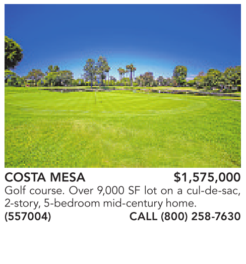 COSTA MESA $1,575,000 Golf course. Over 9,000 SF lot on a cul-de-sac, 2-story, 5-bedroom mid-centuryhome. (557004) CALL (800) 258-7630