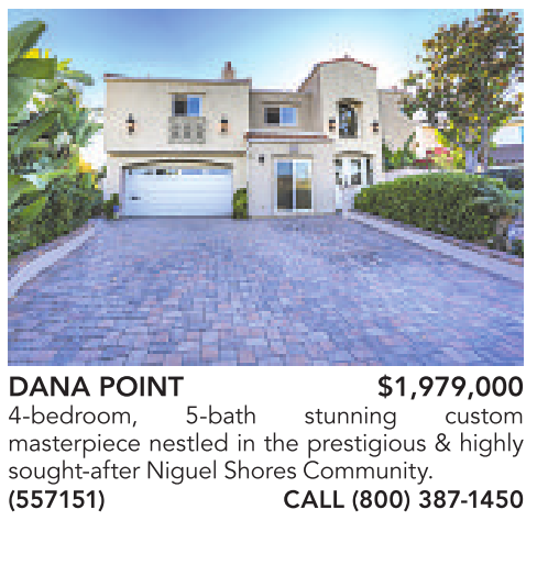 DANA POINT $1,979,000 4-bedroom, 5-bath stunning custom masterpiece nestled in the prestigious & highly sought-after Niguel Shores Community. (557151) CALL (800) 387-1450
