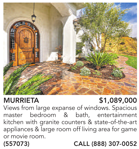 MURRIETA $1,089,000 Views from large expanse of windows. Spacious master bedroom & bath, entertainment kitchen with granite counters & state-of-the-art appliances&largeroom offlivingareafor game or movieroom. (557073) CALL (888) 307-0052