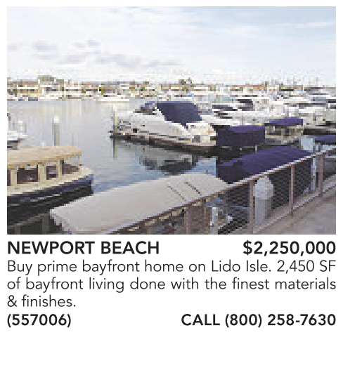 NEWPORT BEACH $2,250,000 Buy prime bayfront home on Lido Isle. 2,450 SF of bayfront living done with the finest materials &finishes. (557006) CALL (800) 258-7630