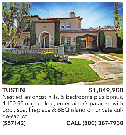 TUSTIN $1,849,900 Nestled amongst hills, 5 bedrooms plus bonus, 4,100SFofgrandeur, entertainer’sparadisewith pool, spa, fireplace & BBQ island on private culde-saclot. (557142) CALL (800) 387-7930