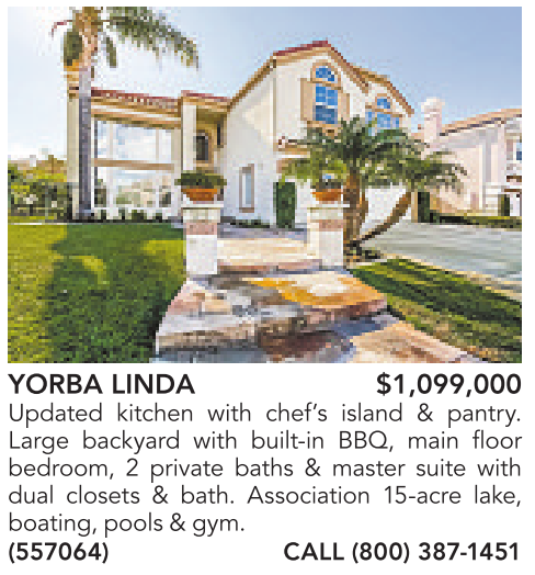 YORBA LINDA $1,099,000 Updated kitchen with chef’s island & pantry. Large backyard with built-in BBQ, main floor bedroom, 2 private baths & master suite with dual closets & bath. Association 15-acre lake, boating, pools &gym. (557064) CALL (800) 387-1451
