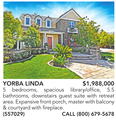 YORBA LINDA $1,988,000 5 bedrooms, spacious library/office, 5.5 bathrooms, downstairs guest suite with retreat area. Expansivefront porch, master with balcony &courtyard with fireplace. (557029) CALL (800) 679-5678