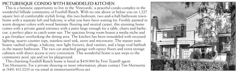 PICTURESQUE CONDO WITH REMODELED KITCHEN This is a fantastic opportunity to live in the ‘Vineyards,’ a peaceful condo complex in the wonderful hillside community of Foothill Ranch. With no one above or below you on 1,227 square feet of comfortable stylish living, this two-bedroom, two-and-a-half-bathroom townhome with a separate loft and balcony, is what you have been waiting for. Freshly painted in warm designer colors with wood laminate flooring and neutral carpet, this stunning home comes with a private gated entrance with a patio large enough for a table, chairs and barbecue, a perfect place to catch some sun. The spacious living room boasts a media niche and a gas fireplace overlooking the dining area. The kitchen has been remodeled with recessed lighting, quartz counter tops, stainless steel sink, stove and microwave. The master suite boasts vaulted ceilings, a balcony, new light fixtures, dual vanities, and a large oval bathtub in the master bathroom. The two-car attached garage with epoxy floors and extra storage cabinets with direct access is very convenient. This wonderful home is just steps to the community pool, spa and tot lot playground. This charming Foothill Ranch home is listed at $419,900 by First Team® agent Tim Morissette. For a private showing or more information, please contact Tim Morissette at (949) 412-2233 or via email at timmorissette@cox.net.