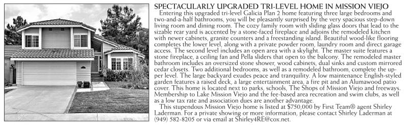 This stupendous Mission Viejo home is listed at $750,000 by First Team® agent Shirley Laderman. For a private showing or more information, please contact Shirley Laderman at (949) 582-8205 or via email at Shirley4RE@cox.net.