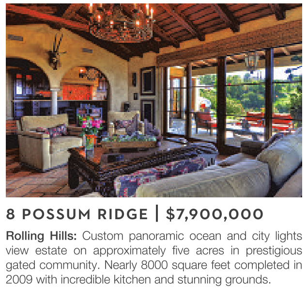 Rolling Hills: Custom panoramic ocean and city lights view estate on approximately five acres in prestigious gated community. Nearly 8000 square feet completed in 2009 with incredible kitchen and stunning grounds.