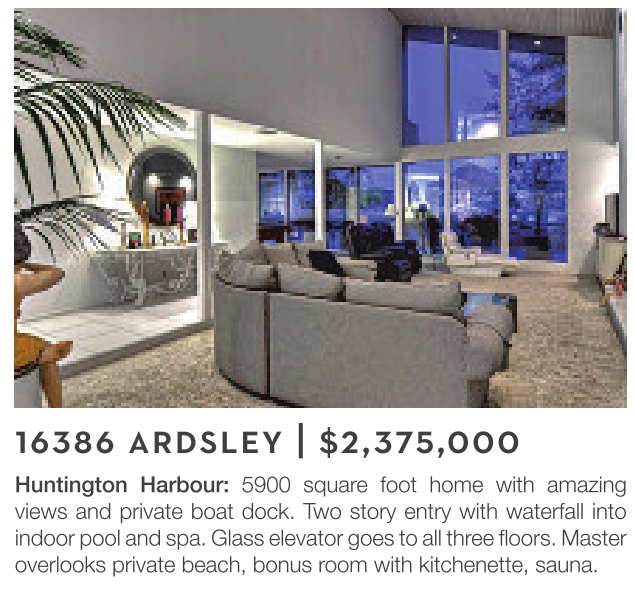 Huntington Harbour: 5900 square foot home with amazing views and private boat dock. Two story entry with waterfall into indoor pool and spa. Glass elevator goes to all three floors. Master overlooks private beach, bonus room with kitchenette, sauna.