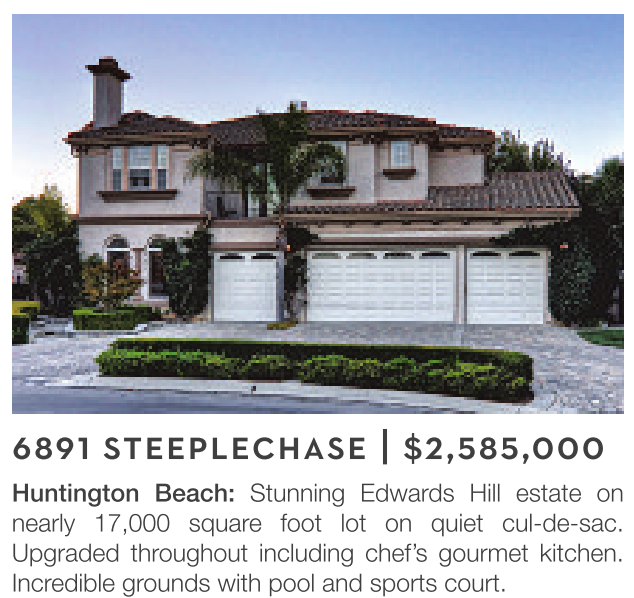 Huntington Beach: Stunning Edwards Hill estate on nearly 17,000 square foot lot on quiet cul-de-sac. Upgraded throughout including chef’s gourmet kitchen. Incredible grounds with pool and sports court.