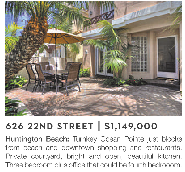 Huntington Beach: Turnkey Ocean Pointe just blocks from beach and downtown shopping and restaurants. Private courtyard, bright and open, beautiful kitchen. Three bedroom plus office that could be fourth bedrooom.