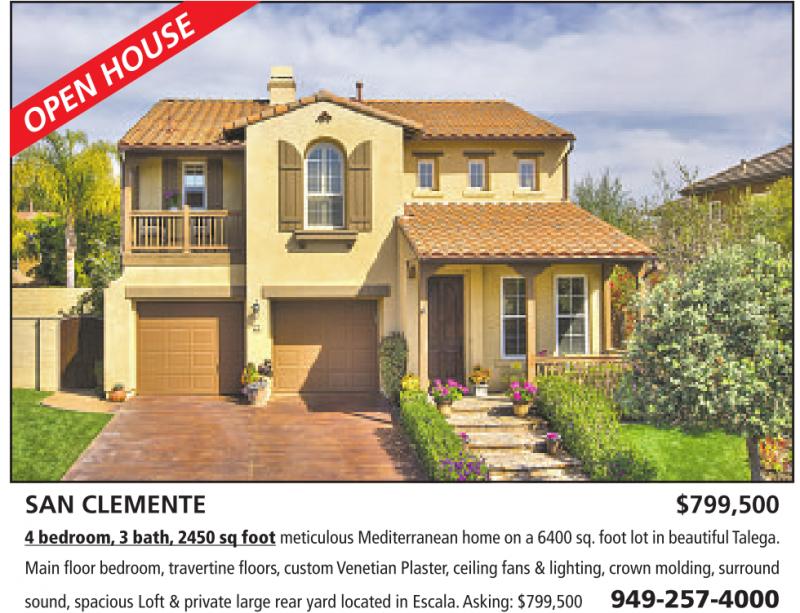 4bedroom, 3bath, 2450 sq foot meticulous Mediterranean home on a6400 sq. foot lot in beautiful Talega. Mainfloor bedroom, travertine floors,custom Venetian Plaster,ceiling fans &lighting, crown molding, surround sound,spacious Loft &private large rear yard located in Escala. Asking: $799,500 949-257-4000