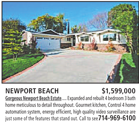 NEWPORT BEACH $1,599,000 Gorgeous NewportBeach Estate…. Expanded andrebuilt 4bedroom3bath homemeticulous to detail throughout.Gourmet kitchen,Control 4home automation system, energy efficient, high quality video surveillance are just some of the features that stand out.Calltosee714-969-6100