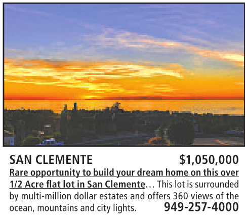 1/2Acreflat lot in SanClemente…This lotissurrounded by multi-million dollar estates and offers 360 views ofthe ocean,mountains andcitylights. 949-257-4000