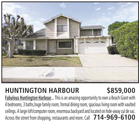 HUNTINGTON HARBOUR $859,000 FabulousHuntingtonHarbour... This is an amazingopportunitytoown aBeachGiant with 4bedrooms,3baths,huge family room,formal diningroom, spacious living room with vaulted ceilings.Alarge loft/computer room,enormous backyard andlocated on hide-away cul de sac. Across thestreetfrom shopping, restaurantsand more.Call 714-969-6100