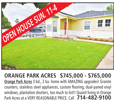 counters, stainless steel appliances, custom flooring, dual-paned vinyl windows,plantationshutters, toomuch to list!! Quaintliving in Orange Park AcresataVERY REASONABLE PRICE. Call 714-482-9100