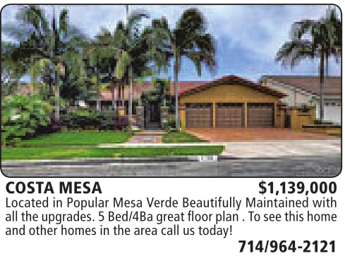 COSTA MESA $1,139,000 Located in Popular Mesa Verde Beautifully Maintained with allthe upgrades. 5Bed/4Ba great floorplan.Tosee this home and other homes in theareacallustoday!