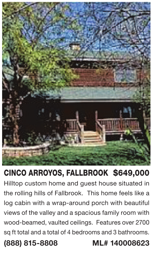 CINCO ARROYOS, FALLBROOK $649,000 Hilltop custom home and guest house situated in the rolling hills of Fallbrook. This home feels like alog cabin with a wrap-around porch with beautiful views of the valley and aspacious family room with wood-beamed,vaultedceilings. Features over2700 sq ft total andatotal of 4bedroomsand 3bathrooms. (888) 815-8808 ML# 140008623