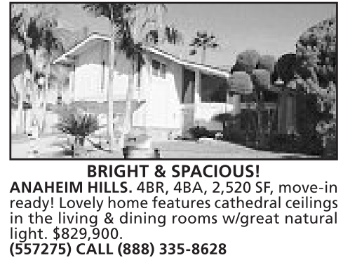 ANAHEIM HILLS. 4BR, 4BA, 2,520 SF, move-in ready!Lovelyhomefeaturescathedral ceilings in the living & dining rooms w/great natural light. $829,900. (557275) CALL (888) 335-8628