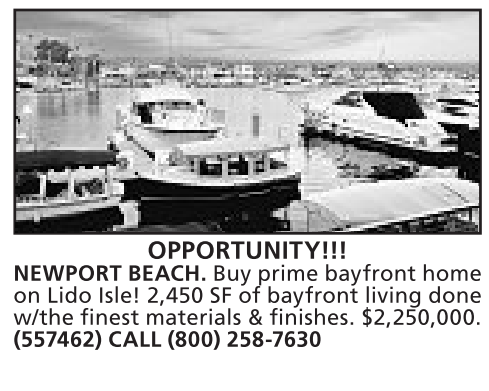 NEWPORT BEACH. Buy prime bayfront home on Lido Isle! 2,450 SF of bayfront living done w/the finest materials & finishes. $2,250,000. (557462) CALL (800) 258-7630