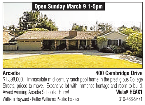 Open Sunday March 91-5pm Arcadia 400 Cambridge Drive $1,398,000. Immaculate mid-century ranch pool home in the prestigious College Streets, priced to move. Expansive lot with immense frontage and room to build. Awardwinning Arcadia Schools. Hurry! Web# HEAX1 William Hayward/Keller Williams Pacific Estates 310-466-9671