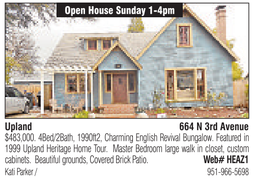 Open House Sunday 1-4pm Upland 664 N3rd Avenue $483,000. 4Bed/2Bath, 1990ft2, Charming English Revival Bungalow. Featured in 1999 Upland Heritage Home Tour. Master Bedroom large walk in closet, custom cabinets. Beautiful grounds, Covered Brick Patio. Web# HEAZ1 Kati Parker / 951-966-5698