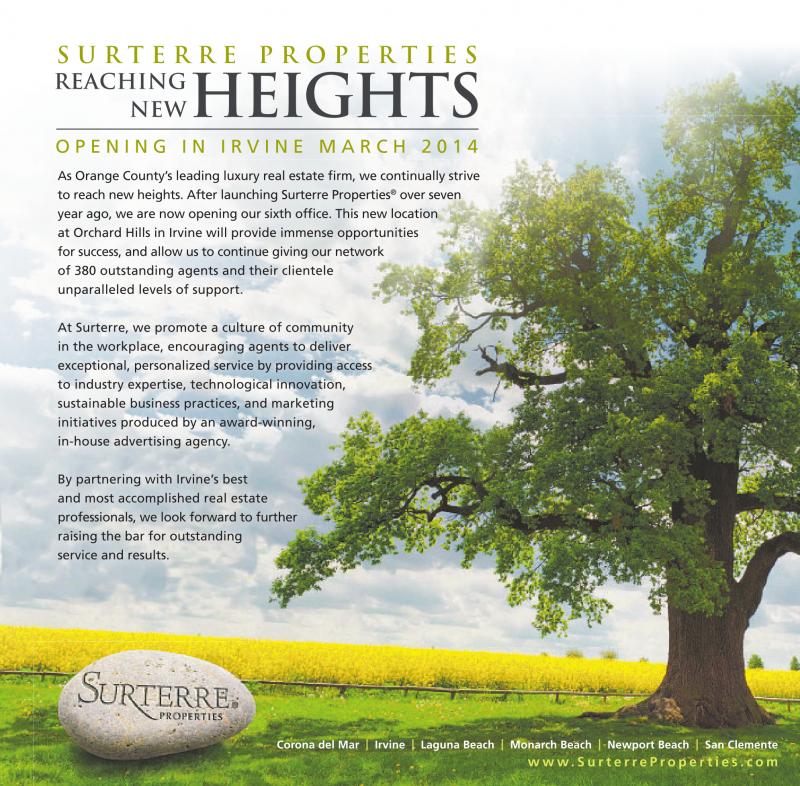 S U R T E R R E Reaching P R O P E R T I E S New Heights O P E N I N G I N I R V I N E M A R C H 2 0 1 4 As Orange County’s leading luxury real estate firm, we continually strive to reach new heights. After launching Surterre Properties ® over seven year ago, we are now opening our sixth office. This new location at Orchard Hills in Irvine will provide immense opportunities for success, and allow us to continue giving our network of 380 outstanding agents and their clientele unparalleled levels of support. At Surterre, we promote a culture of community in the workplace, encouraging agents to deliver exceptional, personalized service by providing access to industry expertise, technological innovation, sustainable business practices, and marketing initiatives produced by an award-winning, in-house advertising agency. By partnering with Irvine’s best and most accomplished real estate professionals, we look forward to further raising the bar for outstanding service and results. Corona del Mar | Irvine | Laguna Beach | Monarch Beach | Newport Beach | San Clemente w w w. S u r t e r r e P r o p e r t i e s . c o m
