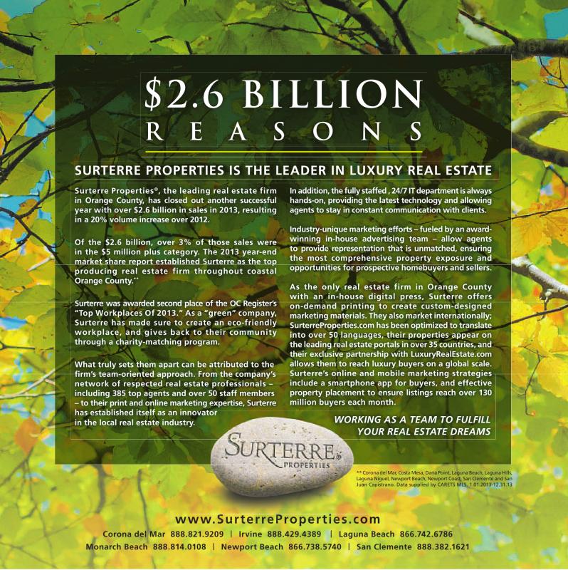 Of the $2.6 billion, over 3% of those sales were in the $5 million plus category. The 2013 year-end market share report established Surterre as the top producing real estate firm throughout coastal Orange County. **
