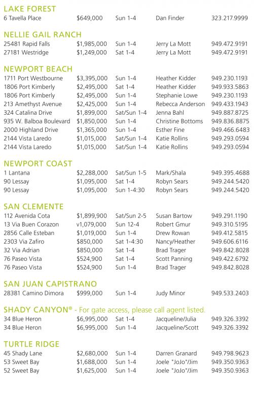 1 Lantana $2,288,000 Sat/Sun 1-5 Mark/Shala 949.395.4688 90 Lessay $1,095,000 Sat 1-4 Robyn Sears 949.244.5420 90 Lessay $1,095,000 Sun 1-4:30 Robyn Sears 949.244.5420