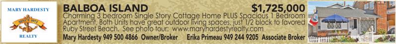 MARY HARDESTY REALTY BALBOA ISLAND $1,725,000 Charming 3 bedroom Single Story Cottage Home PLUS Spacious 1 Bedroom Apartment, Both Units have great outdoor living spaces, just 1/2 block to favored Ruby Street Beach. See photo tour: www.maryhardestyrealty.com Mary Hardesty 949 500 4866 Owner/Broker Erika Primeau 949 244 9205 Associate Broker