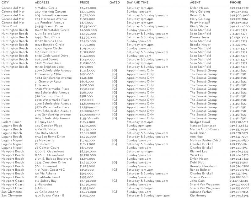 Corona del Mar 3 Malibu Circle $2,495,000 Saturday 1pm-4pm Dylan Mason 949-294-7832 Corona del Mar 440 Morning Canyon $2,195,000 Sunday 1pm-4pm Mary Golding 949.929.3184 Corona del Mar 605 Poinsettia Avenue $1,729,000 Saturday & Sunday 1pm-4pm Brian Rich 949.500.4668 Corona del Mar 709 Narcissus Avenue $1,599,000 Saturday 1pm-4pm Mary Golding 949.929.3184 Corona del Mar 313 Fernleaf Avenue $875,000 Saturday 1pm-5pm Patsy Metcalf 949.629.1280 Dana Point 34545 Scenic Drive $8,350,000 Saturday & Sunday 1pm-4pm Kindy Slagle 949.422.4000 Huntington Beach 16482 Barnstable Circle $4,500,000 Sunday 1pm-4pm Sean Stanfield 714.421.3377 Huntington Beach 17011 Bolero Lane $3,595,000 Saturday & Sunday 1pm-4pm Sean Stanfield 714.421.3377 Huntington Beach 16592 Nalu Circle $3,399,000 Saturday & Sunday 1pm-4pm Powers Team 562.754.4104 Huntington Beach 17022 Baruna Lane $2,985,000 Sunday 1pm-4pm Sean Stanfield 714.421.3377 Huntington Beach 16122 Bonaire Circle $1,795,000 Saturday 1pm-4pm Brooke Meyer 714.342.1194 Huntington Beach 4091 Figaro Circle $1,650,000 Sunday 1pm-4pm Sean Stanfield 714.421.3377 Huntington Beach 616 Crest Street $1,399,000 Saturday & Sunday 1pm-4pm Sean Stanfield 714.421.3377 Huntington Beach 6582 Cedarwood Drive $1,349,000 Sunday 1pm-4pm Sean Stanfield 714.421.3377 Huntington Beach 626 22nd Street $1,149,000 Saturday & Sunday 1pm-4pm Sean Stanfield 714.421.3377 Huntington Beach 3962 Mistral Drive $1,099,000 Saturday 1pm-4pm Sean Stanfield 714.421.3377 Huntington Beach 16532 Brigham Lane $979,000 Saturday & Sunday 1pm-4pm Sean Stanfield 714.421.3377 Irvine 3079 Scholarship Avenue $1,248,000 [G] Appointment Only The Soussé Group 714.412.8512 Irvine 21 Gramercy #306 $658,000 [G] Appointment Only The Soussé Group 714.412.8512 Irvine 5064 Scholarship Avenue $648,888 [G] Appointment Only The Soussé Group 714.412.8512 Irvine 21 Gramercy #302 $608,000 [G] Appointment Only The Soussé Group 714.412.8512 Irvine 7 Delancy $608,000 [G] Appointment Only The Soussé Group 714.412.8512 Irvine 3368 Watermarke Place $530,000 [G] Appointment Only The Soussé Group 714.412.8512 Irvine 1112 Scholarship Avenue $518,000 [G] Appointment Only The Soussé Group 714.412.8512 Irvine 379 Stanford Court $518,000 [G] Appointment Only The Soussé Group 714.412.8512 Irvine 2238 Watermarke Place $358,000 [G] Appointment Only The Soussé Group 714.412.8512 Irvine 3076 Scholarship Avenue $4,800/month [G] Appointment Only The Soussé Group 714.412.8512 Irvine 3270 Watermarke Place $2,750/month [G] Appointment Only The Soussé Group 714.412.8512 Irvine 2323 Scholarship Avenue $2,100/month [G] Appointment Only The Soussé Group 714.412.8512 Irvine 2170 Scholarship Avenue $2,000/month [G] Appointment Only The Soussé Group 714.412.8512 Irvine 1104 Scholarship Avenue $1,550/month [G] Appointment Only The Soussé Group 714.412.8512 Ladera Ranch 9 Emmy Lane $1,249,000 Saturday 1pm-4pm Bridget Hood 949.230.8313 Laguna Beach 345 Camden Place $4,950,000 Sunday 2pm-5pm Nancee Swensson 949.813.6883 Laguna Beach 4 Pacific Vista $2,995,000 Sunday 1pm-4pm Marilie Croul-Bunce 949.357.9936 Laguna Beach 326 Ruby Street $2,345,000 Saturday & Sunday 1pm-4pm Derik Brian 949.370.0771 Laguna Beach 1974 San Remo Drive $2,295,000 Saturday & Sunday 1pm-4pm Ann Ngo 949.632.7205 Laguna Niguel 35 Newcastle $1,775,000 [G] Sunday 1pm-4pm Melissa Davies-Crispi 949-374-7830 Laguna Niguel 15 Belcrest $1,249,000 [G] Saturday & Sunday 1pm-4pm Charles Brickell 949.233.1694 Laguna Niguel 26 Center Court $879,900 Sunday 1pm-4pm Charles Brickell 949.233.1694 Newport Beach 1700 E. Oceanfront $8,750,000 Saturday 1pm-4pm Richard Lee 949.466.3223 Newport Beach 1700 E. Oceanfront $8,750,000 Sunday 1pm-4pm Vicki Lee 949.466.3223 Newport Beach 2105 E. Balboa Boulevard $4,199,000 Sunday 1pm-4pm Dylan Mason 949-294-7832 Newport Beach 2525 Crestview Drive $2,695,000 [G] Sunday 1pm-5pm Debi Bibb 949-533-5101 Newport Beach 308 Holmwood $1,925,000 Sunday 1pm-4pm Beverly Cleveland 949.394.6500 Newport Beach 3121 West Coast #8C $850,000 [G] Saturday 1pm-4pm Renee Bolster 949.400.0789 Newport Beach 101 Via Athena $565,000 Saturday & Sunday 1pm-4pm Charles Brickell 949.233.1694 Newport Beach 12 Latitude Court $459,000 Sunday 1pm-4pm Sharon Paxson 949.280.0681 Newport Coast 134 Sidney Bay $2,598,000 [G] Saturday & Sunday 1pm-4pm John Cain 714.655.8940 Newport Coast 3 Highpoint $2,250,000 Sunday 1pm-4pm Sherri Van Wagenen 949.939.0008 Newport Coast 9 Altino $1,595,000 Saturday 1pm-4pm Sherri Van Wagenen 949.939.0008 San Clemente 44 Calle Ameno $3,499,000 [G] Sunday 1pm-4pm Adriana Farfan 949.400.9136 San Clemente 1501 Buena Vista – B $1,675,000 Saturday & Sunday 12pm-4pm Kip Horney 949.290.8595