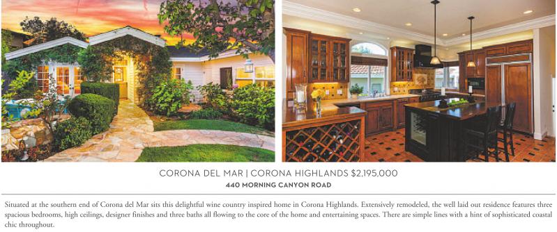 38 CORONA DEL MAR | CORONA HIGHLANDS $2,195,000 440 MORNING CANYON ROAD Situated at the southern end of Corona del Mar sits this delightful wine country inspired home in Corona Highlands. Extensively remodeled, the well laid out residence features three spacious bedrooms, high ceilings, designer finishes and three baths all flowing to the core of the home and entertaining spaces. There are simple lines with a hint of sophisticated coastal chic throughout.