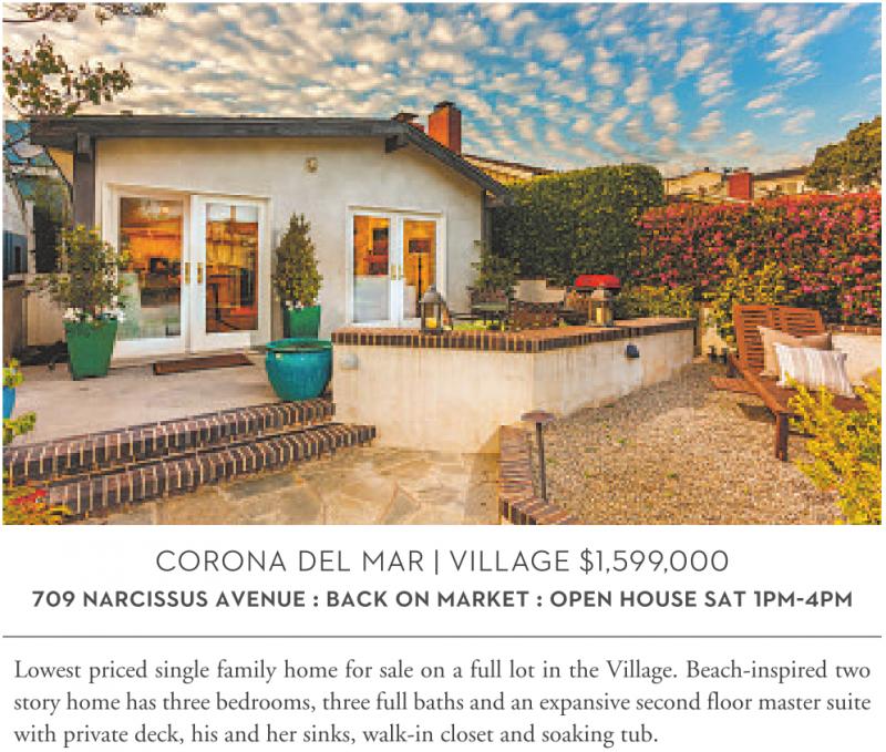 CORONA DEL MAR | VILLAGE $1,599,000 709 NARCISSUS AVENUE : BACK ON MARKET : OPEN HOUSE SAT 1PM-4PM Lowest priced single family home for sale on a full lot in the Village. Beach-inspired two story home has three bedrooms, three full baths and an expansive second floor master suite with private deck, his and her sinks, walk-in closet and soaking tub.