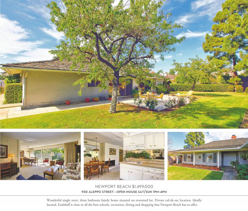NEWPORT BEACH $1,499,000 930 ALEPPO STREET : OPEN HOUSE SAT/SUN 1PM-4PM Wonderful single story, three bedroom family home situated on oversized lot. Private cul-de-sac location. Ideally located, Eastbluff is close to all the best schools, recreation, dining and shopping that Newport Beach has to offer.