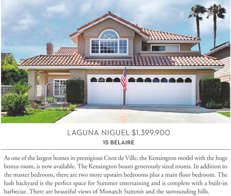 LAGUNA NIGUEL $1,399,900 15 BELAIRE As one of the largest homes in prestigious Crest de Ville, the Kensington model with the huge bonus room, is now available. The Kensington boasts generously sized rooms. In addition to the master bedroom, there are two more upstairs bedrooms plus a main floor bedroom. The lush backyard is the perfect space for Summer entertaining and is complete with a built-in barbecue. There are beautiful views of Monarch Summit and the surrounding hills.