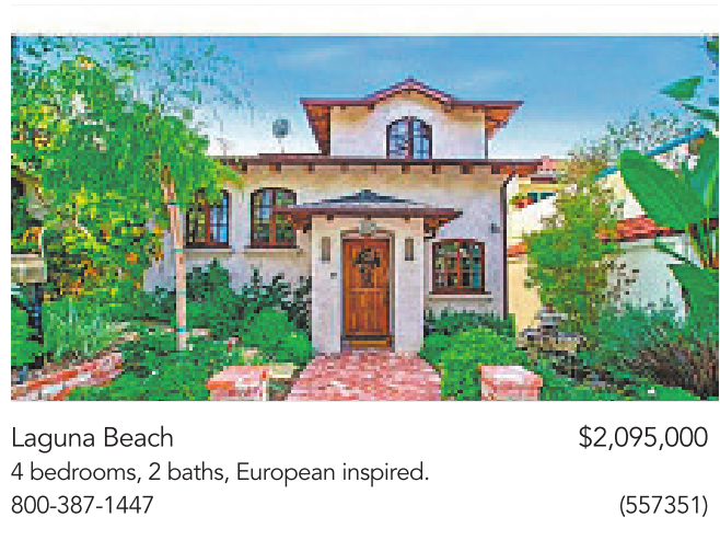 Laguna Beach $2,095,000 4bedrooms, 2baths, European inspired. 800-387-1447 (557351)