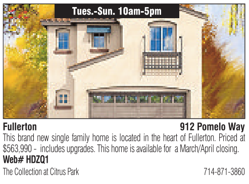 Fullerton 912 Pomelo Way This brand new single family home is located in the heart ofFullerton. Priced at $563,990 - includes upgrades. This home is available for aMarch/April closing. Web# HDZQ1 The Collection at Citrus Park 714-871-3860