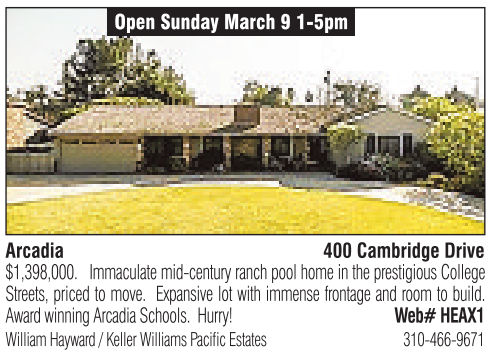 Open Sunday March 91-5pm Arcadia 400 Cambridge Drive $1,398,000. Immaculate mid-century ranch pool home in the prestigious College Streets, priced to move. Expansive lot with immense frontage and room to build. Awardwinning Arcadia Schools. Hurry! Web# HEAX1 William Hayward/Keller Williams Pacific Estates 310-466-9671