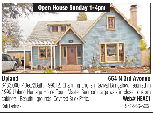 Upland 664 N3rd Avenue $483,000. 4Bed/2Bath, 1990ft2, Charming English Revival Bungalow. Featured in 1999 Upland Heritage Home Tour. Master Bedroom large walk in closet, custom cabinets. Beautiful grounds, Covered Brick Patio. Web# HEAZ1 Kati Parker / 951-966-5698