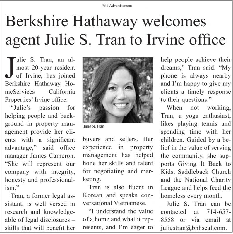 Paid Advertisement Berkshire Hathaway welcomes agent Julie S. Tran to Irvine office Julie S. Tran, an almost 20-year resident of Irvine, has joined Berkshire Hathaway HomeServices California Properties’Irvine office. “Julie’s passion for helping people and background in property management provide her clients with a significant advantage,” said office manager James Cameron. “She will represent our company with integrity, honesty and professionalism.” Tran, a former legal assistant, is well versed in research and knowledgeable of legal disclosures – skills that will benefit her Julie S. Tran buyers and sellers. Her experience in property management has helped hone her skills and talent for negotiating and marketing. Tran is also fluent in Korean and speaks conversational Vietnamese. “I understand the value of a home and what it represents, and I’m eager to help people achieve their dreams,” Tran said. “My phone is always nearby and I’m happy to give my clients a timely response to their questions.” When not working, Tran, a yoga enthusiast, likes playing tennis and spending time with her children. Guided by a belief in the value of serving the community, she supports Giving It Back to Kids, Saddleback Church and the National Charity League and helps feed the homeless every month. Julie S. Tran can be contacted at 714-657- 8558 or via email at juliestran@bhhscal.com. See also