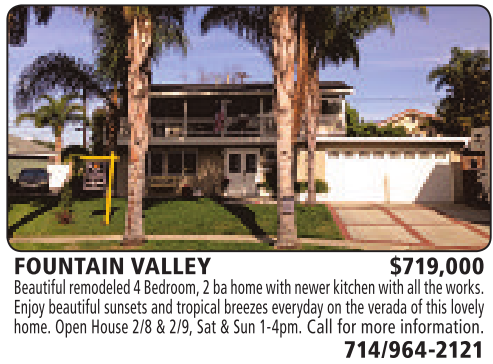 FOUNTAIN VALLEY $719,000 Beautifulremodeled4Bedroom, 2bahome with newer kitchen with allthe works. Enjoy beautiful sunsets and tropical breezes everyday on the verada of this lovely home. Open House 2/8 &2/9, Sat &Sun 1-4pm. Call for more information. 714/964-2121